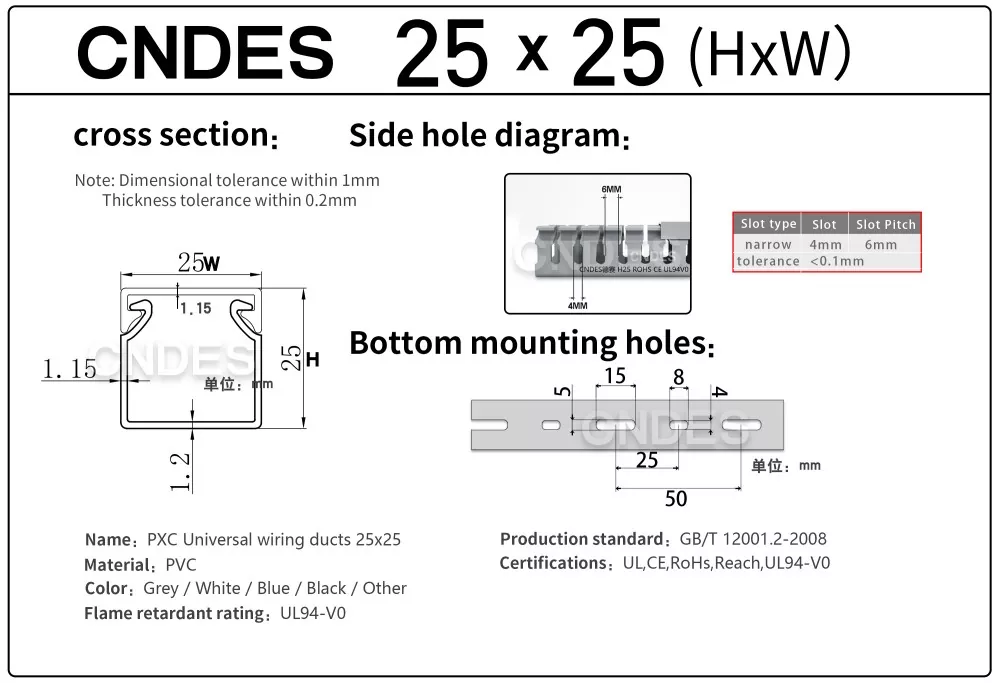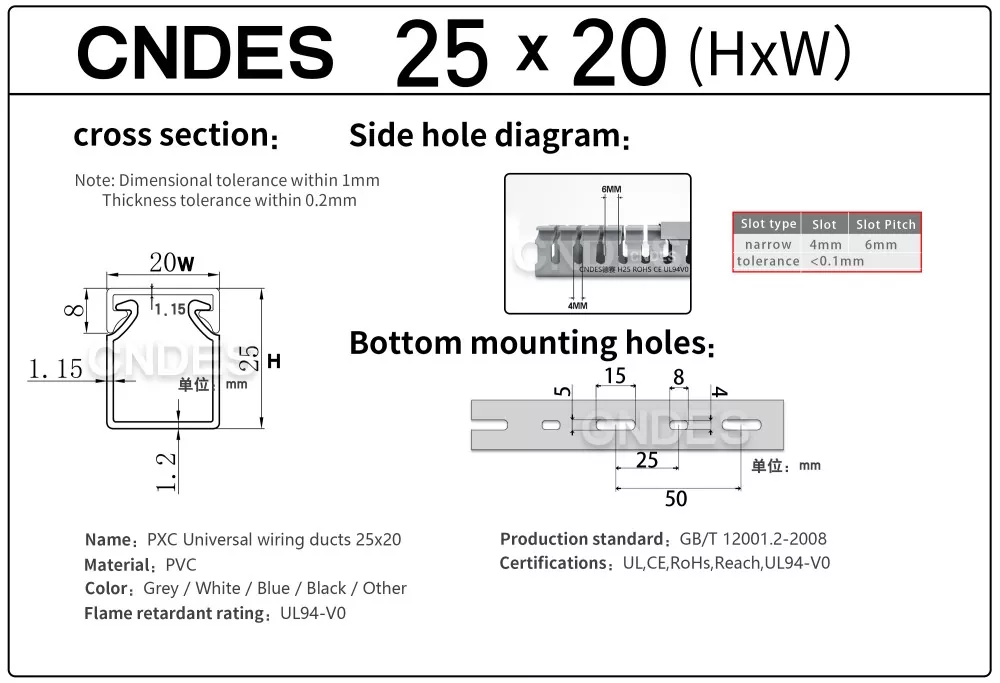 Чрез нашето независимо разработено високопрецизно оборудване за щамповане, съчетано с уникален сегментиран автоматичен процес на рязане, CNDES може гъвкаво да произвежда продукти в множество спецификации, включително високопроизводителни канали за контролен панел с прорези от PVC с височина 25 mm, отговарящи на разнообразните нужди на клиентите в контролни шкафове и електрически системи.