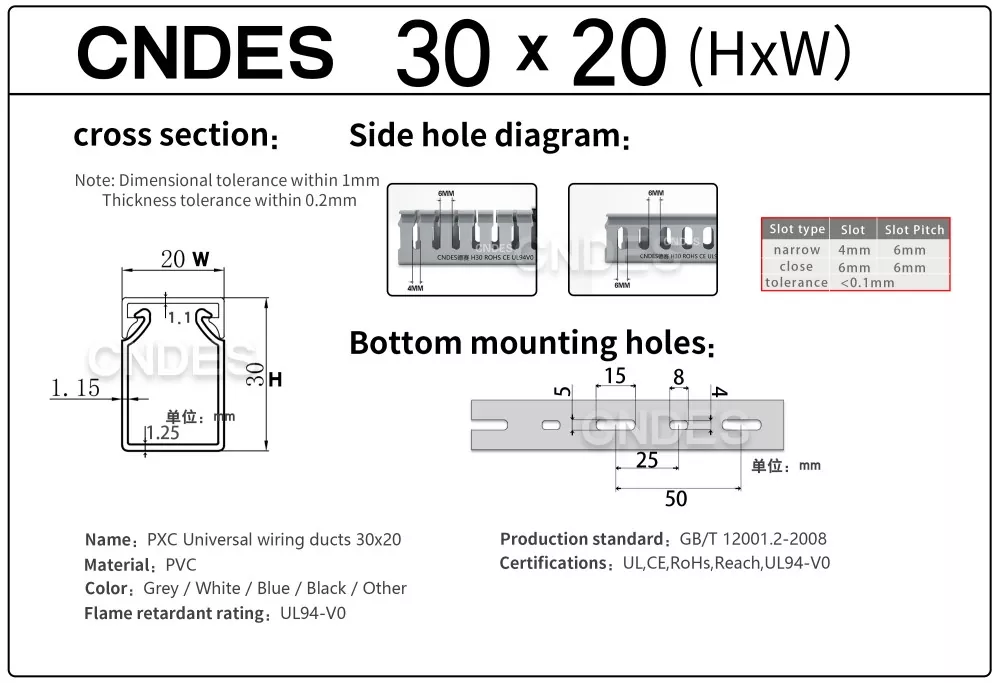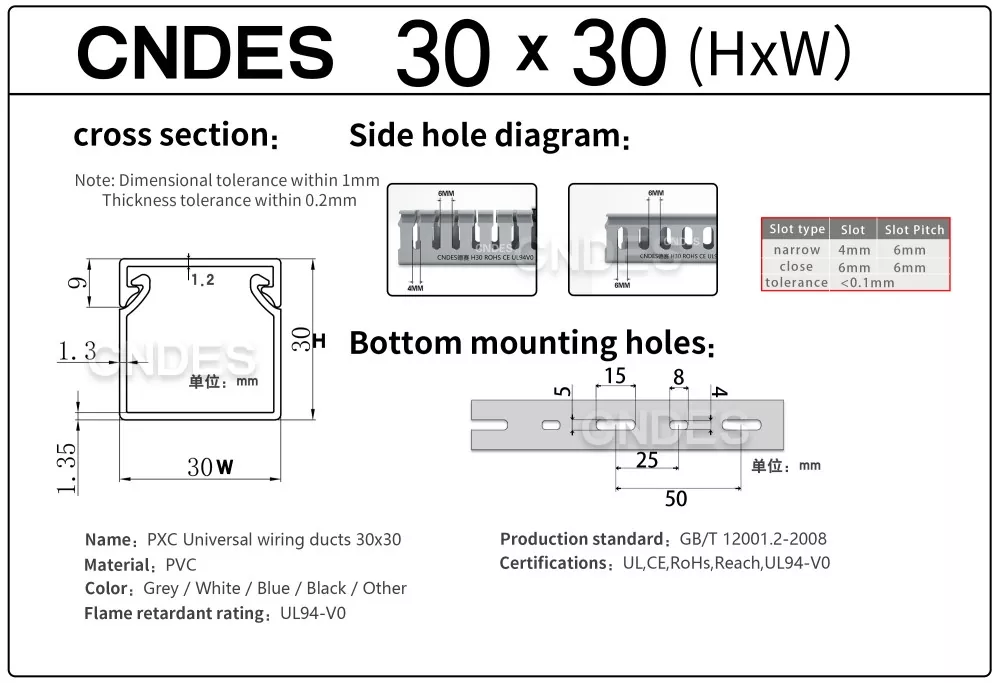 Той включва информация като дебелината, размерите и пробиването на нашия качествен PVC кабелен канал с прорези с височина 30 mm.