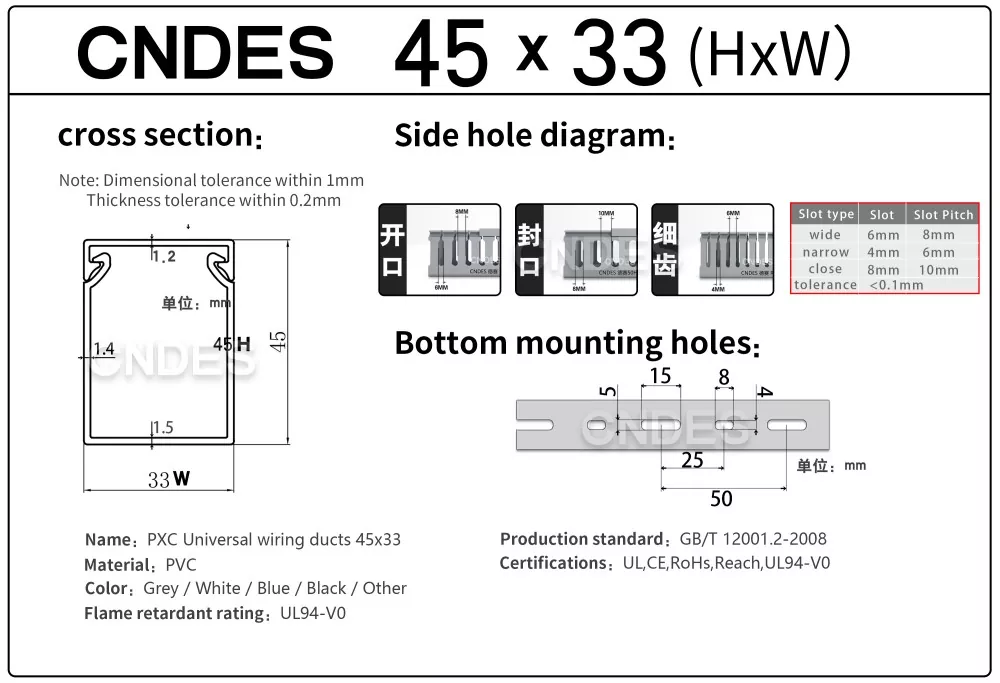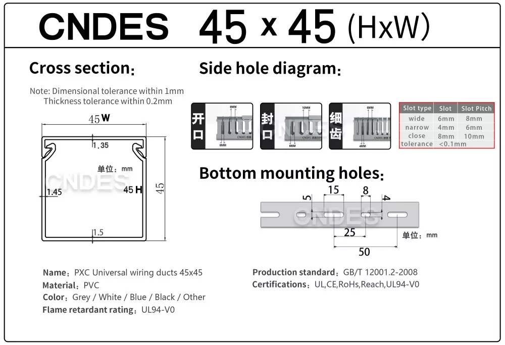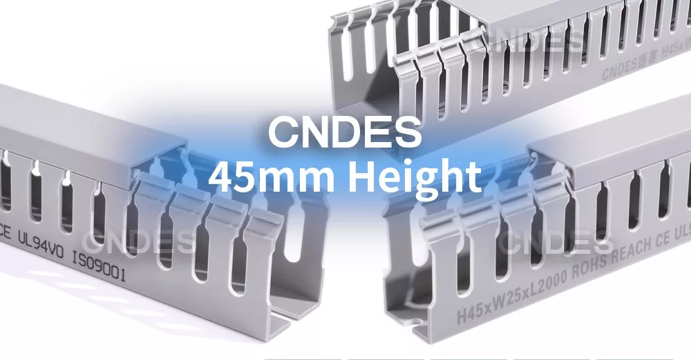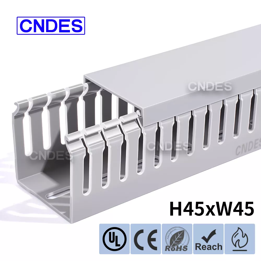 Като професионален производител, ние бихме искали да ви предоставим 45 mm височина CNDES прорезен PVC проводник с капак. Включително 45*25, 45*33, 45*45.
