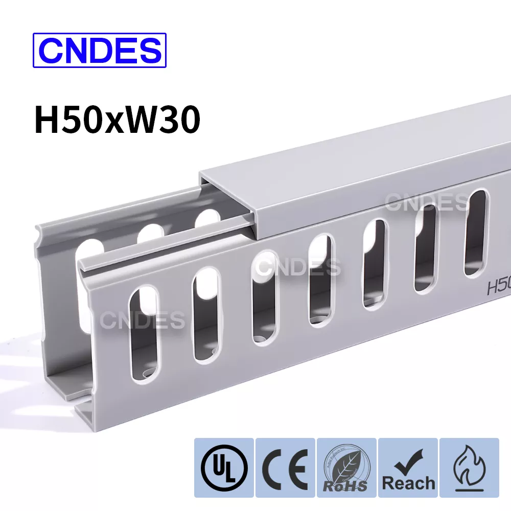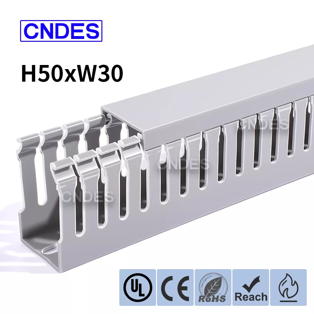 Качественият канал за организиране на кабели от PVC 50 × 30 от CNDES е компактно, ефективно решение за управление на кабели в тесни пространства, като малки контролни шкафове, кутии за данни и съединителни кутии за оборудване. Този кабелен канал с тънък профил позволява на монтажниците да организират, разделят и защитават кабелите, без да заемат излишно пространство на панела.