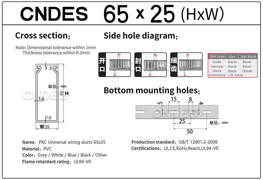 Персонализираните канали за кабелни скари 65×25 на CNDES са канали за управление на кабели с тънък профил, изработени от твърд PVC. Използва се главно за насочване и защита на кабели в области, където: