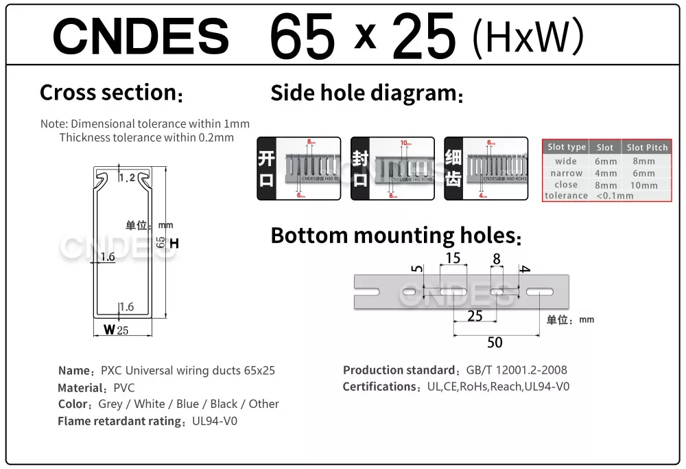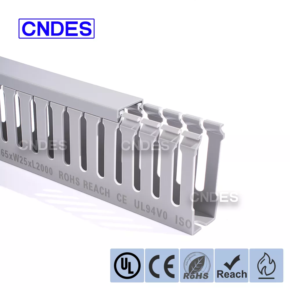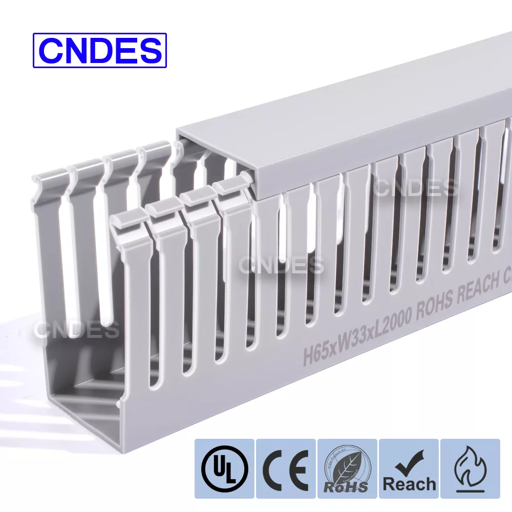 CNDES е фабрика за PVC кабелни канали с 24 години опит. Персонализираният 65-милиметров прорезен PVC канал за промишлено окабеляване е идеално решение за организиране и защита на окабеляване в среда с висока плътност, като индустриални контролни панели, оборудване за автоматизация и машинни инсталации. С височина от 65 mm, той предлага достатъчно пространство за побиране на по-големи кабелни снопове, като същевременно осигурява оптимална защита от фактори на околната среда като прах, влага и механични повреди.