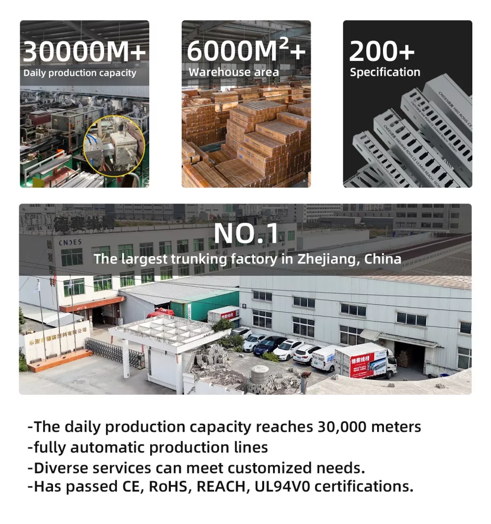 Като професионален производител на PVC кабелни канали, CNDES има стабилни доставки с 13 производствени линии, дневна производителност до 30 000 метра и 6000 квадратни метра складови наличности с над 200 спецификации. Нашата система за инспекция на качеството контролира стриктно продуктите: от скрининг на суровини и мониторинг на производството в реално време до окончателно вземане на партидни проби, като гарантира, че процентът на фабричните дефекти на продуктите е под 0,5% и винаги е надежден.