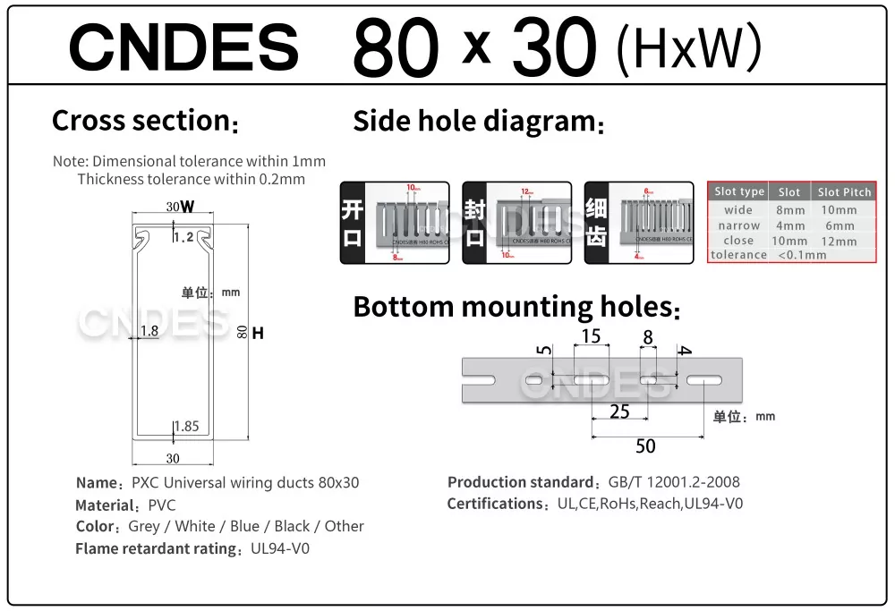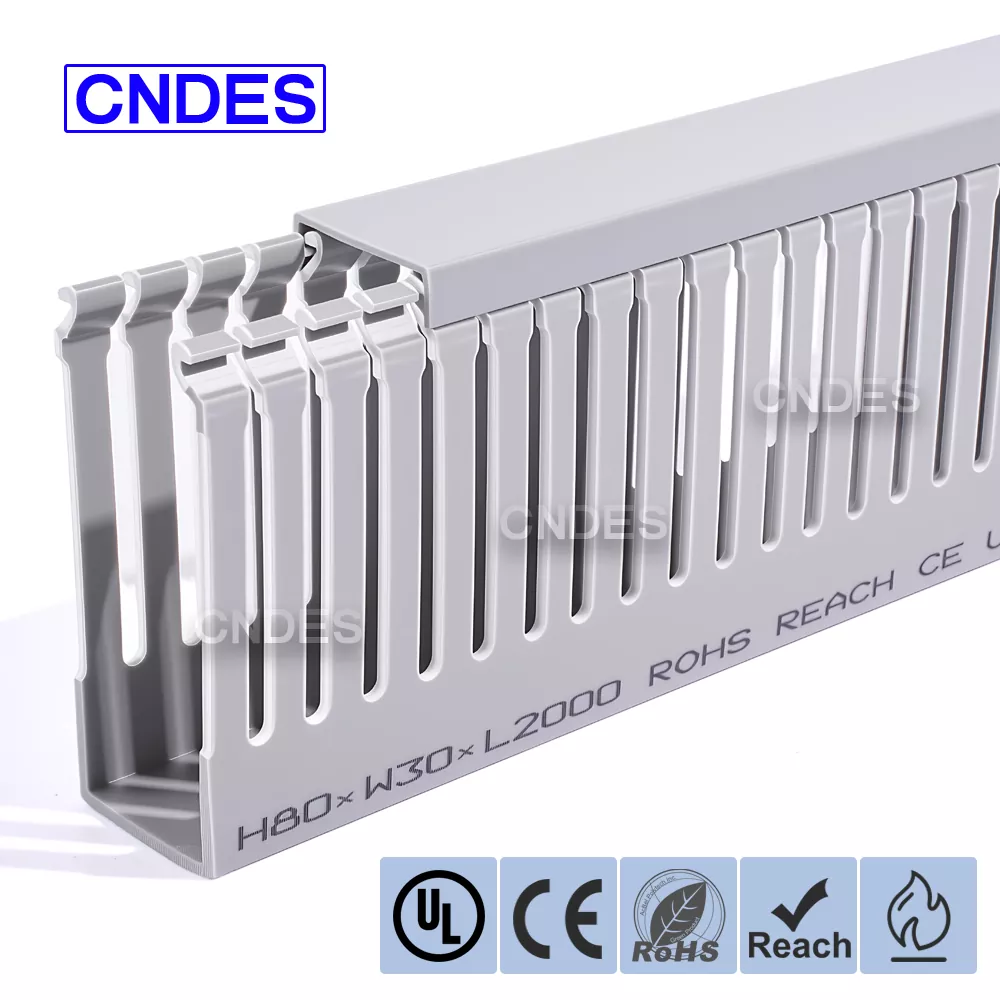 CNDES' High-Performance 80×30 Open Slot PVC Wiring Ducts are designed for efficient, organized, and flexible cable management in industrial control panels, electrical cabinets, and automation cabinets. With a height of only 30 mm and a width of only 80 mm, these compact ducts provide a high-density cable management solution while facilitating installation, maintenance, and future upgrades.