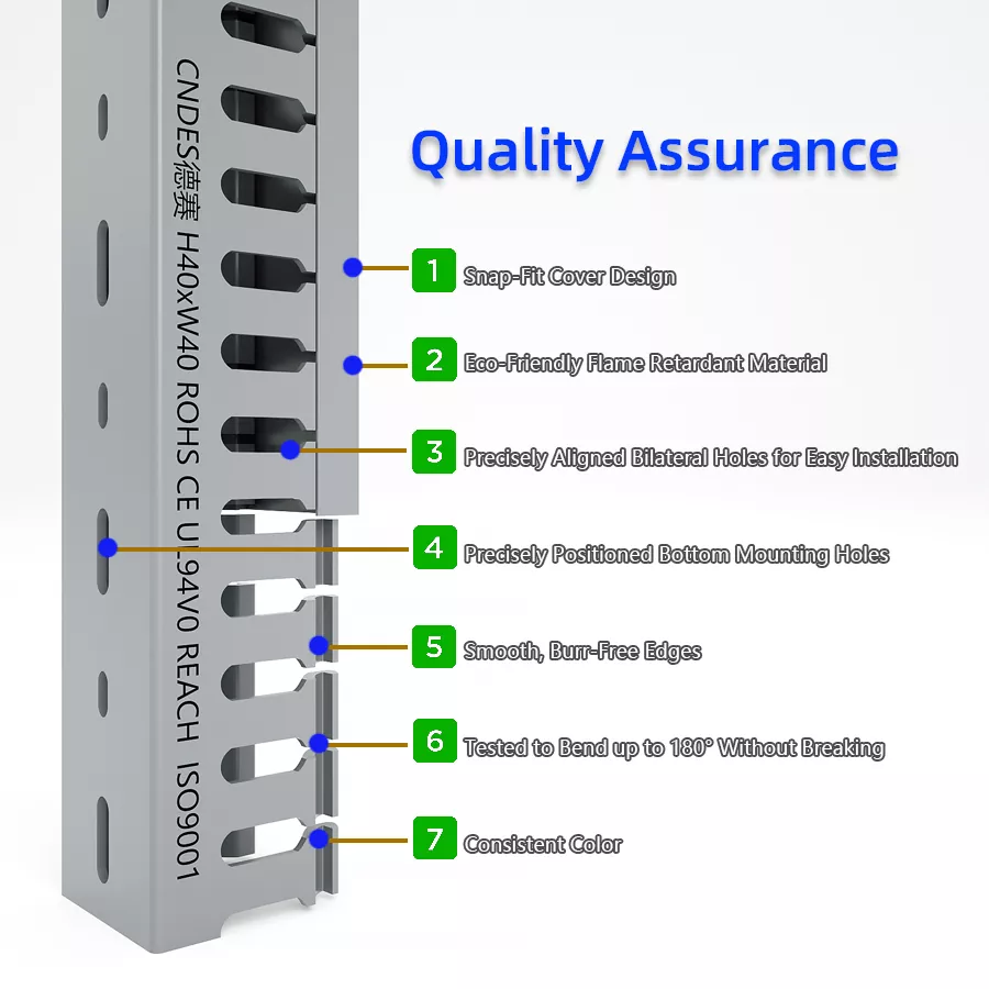 CNDES е доверен производител и доставчик на PVC кабелни скари в Китай. Ние гарантираме стабилно качество на продукта, прецизно разстояние между слотовете и съответствие със стандартите UL, CE, RoHS и REACH, подходящи за проекти както в страната, така и в чужбина.