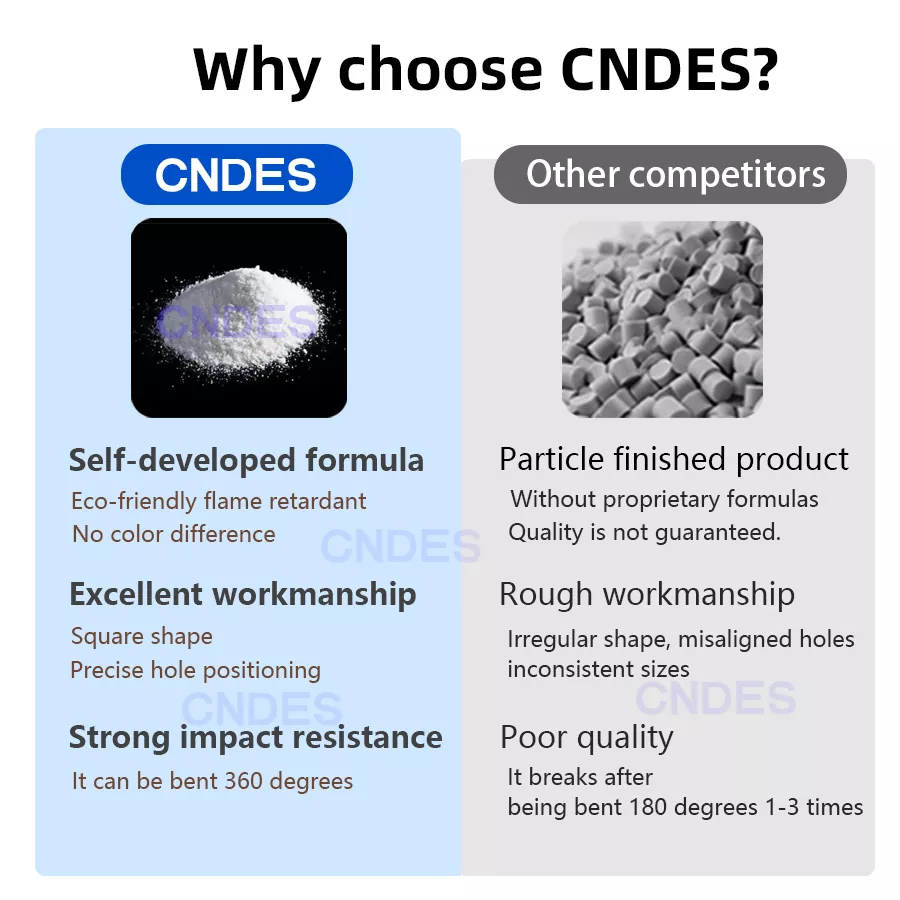 CNDES, като професионална фабрика за научноизследователска и развойна дейност и производство на Black Slotted PVC Wiring Duct в Китай, е специализирана в масово производство, строг ISO контрол на качеството и OEM/ODM услуга. Черните корпуси обикновено се използват в сценарии, изискващи скрито окабеляване (като домашни кина или офиси) или за разграничаване между различни функционални вериги (напр. линии за високо и ниско напрежение), като по този начин подобряват управлението ефективност.